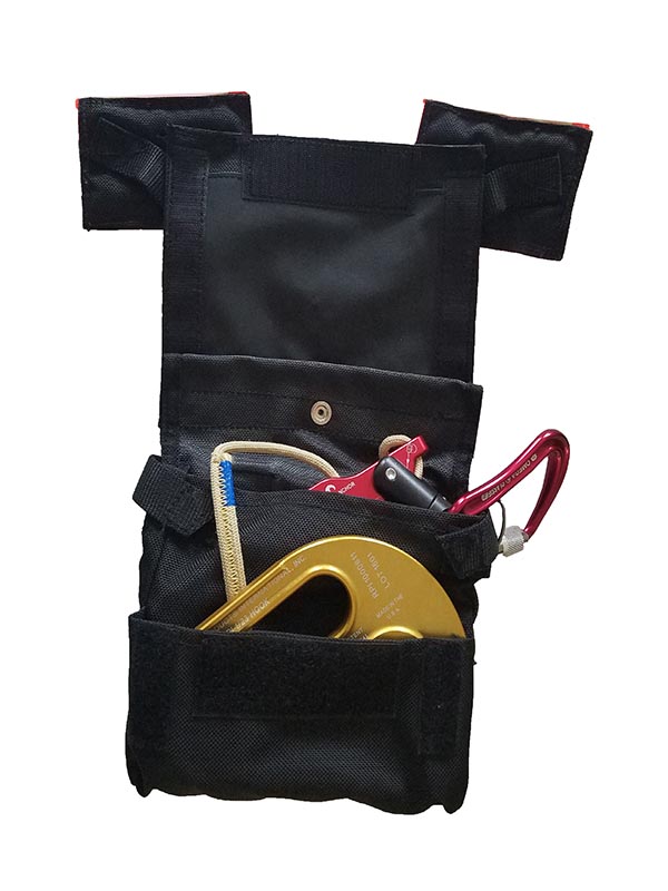 The RPI Hip pouch is designed for both the right and left side of the firefighter and should be mounted opposite of the closure of the waist belt of the harness. The pouch is designed in a two part configuration, the front part being the hook storage area and the rear section being the rope and descender storage area. The pouch can easily hold the RPI Hook and the RPI 1/23 Hook as well as all other certified escape hooks available today. The pouch is designed to hold up to 50’ of 7.5mm Escape Rope or up to 50’ of RPI Escape Webbing. While originally designed to for the RPI System only, the Hip pouch has the ability to hold multiple different escape systems currently available on the market. The pouch is designed with a tear-a-way top flap that is designed to be removed during deployment to prevent accidental closing due to conditions.